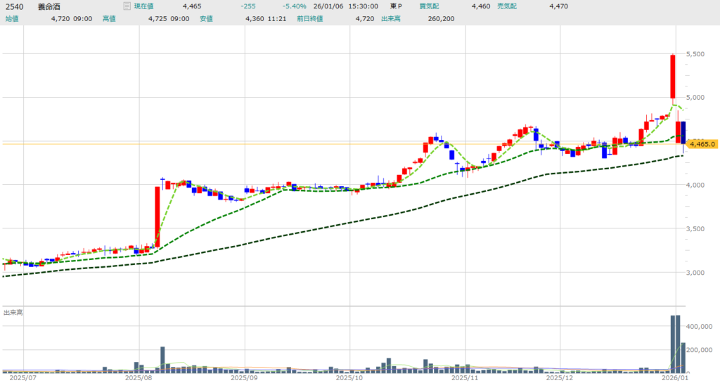 - 急騰の理由: 12月末に米投資会社KKRが買収の優先交渉権を得たと報じられ、TOB価格への期待から5,700円台まで吹き上げました。