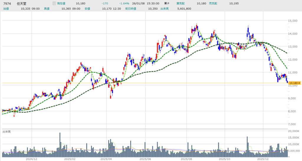 - 『あつ森』最新作の発売: 来週 1月15日には、Switch 2版の『あつまれ どうぶつの森』が発売されます。このローンチが再びハードの牽引役となり、株価反転のカタリスト(きっかけ)になるかが最大の注目点です。