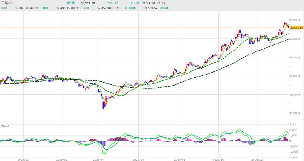 週明けからの嫌な流れが止まらず、日経平均は心理的節目の53,000円を割り込む厳しい展開となりました。