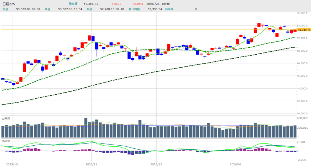 • 日経平均終値:53,358.71円(前日比 +25.17円 / +0.05%)