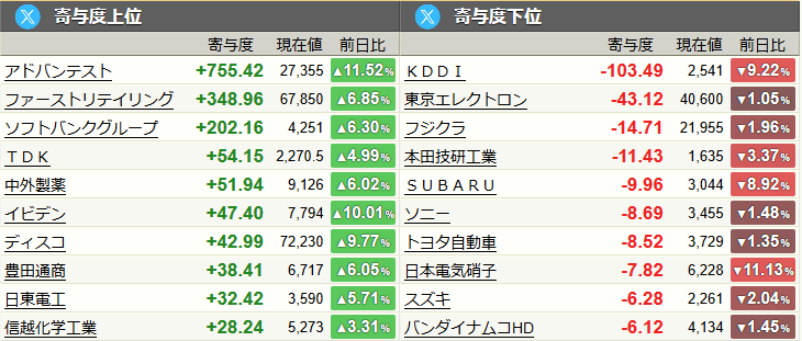 • 寄与度(きよど): 個別銘柄が日経平均という指数全体を何円押し上げたか(下げたか)を示す指標。