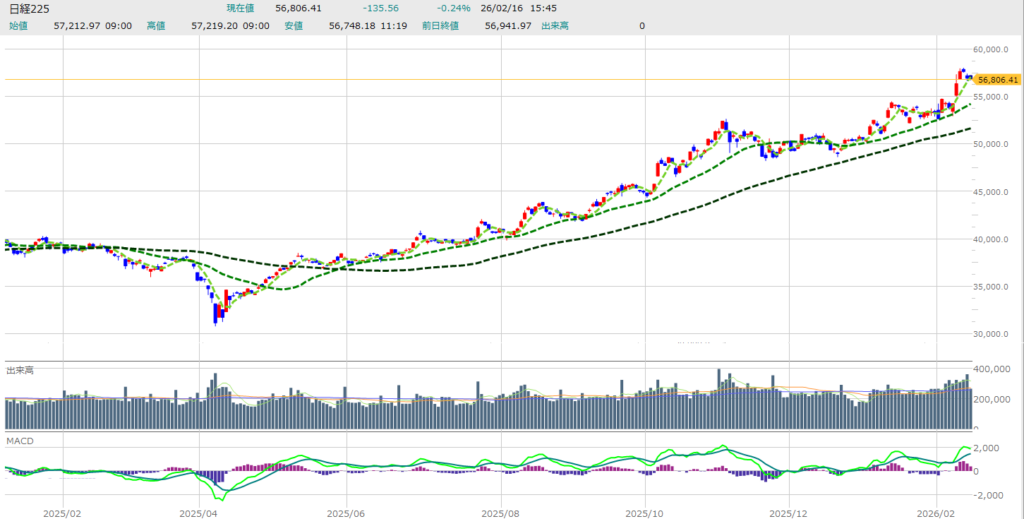 - テクニカル的な過熱感の調整 日経平均株価は2026年初頭から急ピッチで上昇してきたため、5万7000円付近での足踏みは、過熱したMACD(トレンドの勢いを示す指標)を冷ますための健全な調整局面と判断できます。