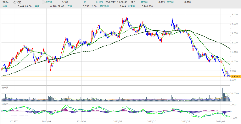 現在の任天堂は、記録的なヒットとなった「Nintendo Switch」の次世代機に関する正式発表が待たれる、いわば「情報の真空地帯」にあります。チャート(添付画像参照)を見れば一目瞭然ですが、株価は8,409円付近。25日・75日・200日のすべての移動平均線を割り込み、非常に厳しい「下落トレンド」の真っ只中にあります。