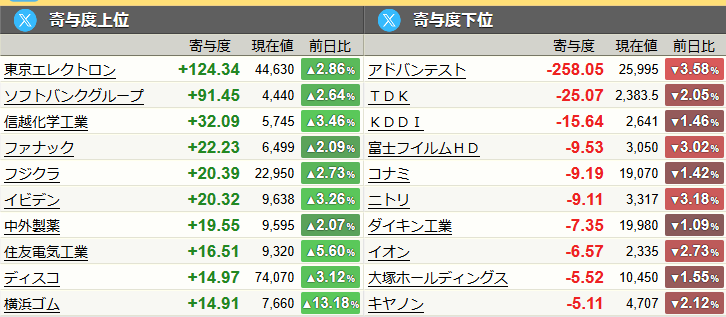 影響度:プラス91.45円 関連要因: 前日の調整を経て、本日は2.64パーセントの反発を見せました。 傘下の英アーム株の好調や、グローバルなテック投資への意欲回復が追い風となっています。 同社のような値がさ大型株の反発は、市場全体のセンチメント改善に大きく寄与しました。