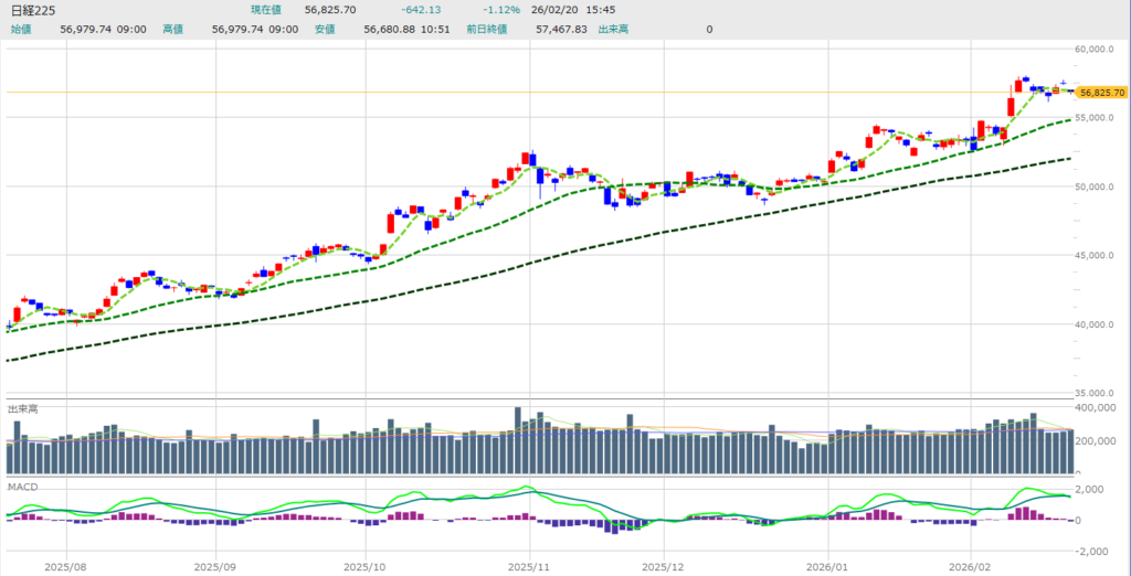 ・終値:56,825.70円 ・前日比:-642.13円(-1.12%)