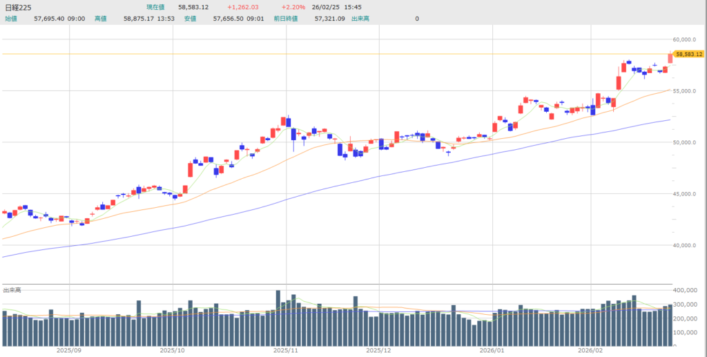 寄り付きから昨日の終値を大きく上回ってスタートし、その後も利益確定売りをこなしながら上昇を続けました。午後に入ると一段高となり、13時53分には本日の高値である5万8875円を記録。大引けにかけても高値圏を維持し、歴史的な一日を締めくくりました。
