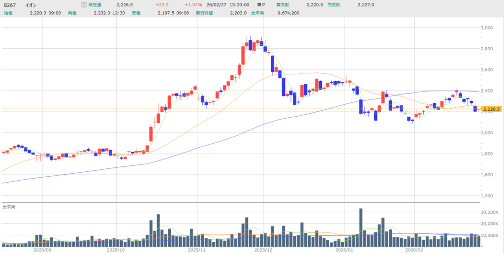 今日は2026年2月27日。イオンの2月権利付最終日(2月25日)を過ぎ、市場には権利落ちによる強烈な売り圧力が押し寄せていますね。株主優待目当ての買いが一巡し、株価が調整局面に入った今、この銘柄に俺たちの血肉を分けた資金を投じる価値があるのか。その真実を解剖していきましょう。