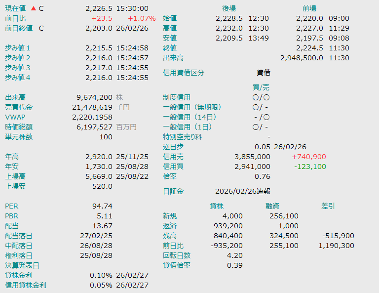 最新株価:2,295円(直近1ヶ月で約15パーセントの下落) 解説:まさに「自由落下」の状態です。 2月25日の権利付最終日から急落が続いており、心理的な節目である2,300円を割り込みました。安く見えますが、底打ちはまだ先だと俺は見ている。