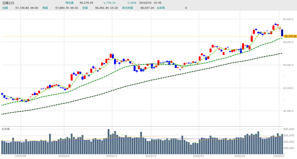 本日はサラリーマン投資家としての視点から、記録的な大暴落となった日本市場の銘柄動向を分析します。 日経平均株価は前日比マイナス1778.19円という衝撃的な下落を記録し、終値は56279.05円となりました。 中東情勢の緊迫化という砲火を浴び、昨日までの熱狂が嘘のような焦土と化していますが、こういう時こそ冷静に「誰が売られ、誰が踏みとどまったか」を直視する必要があります。