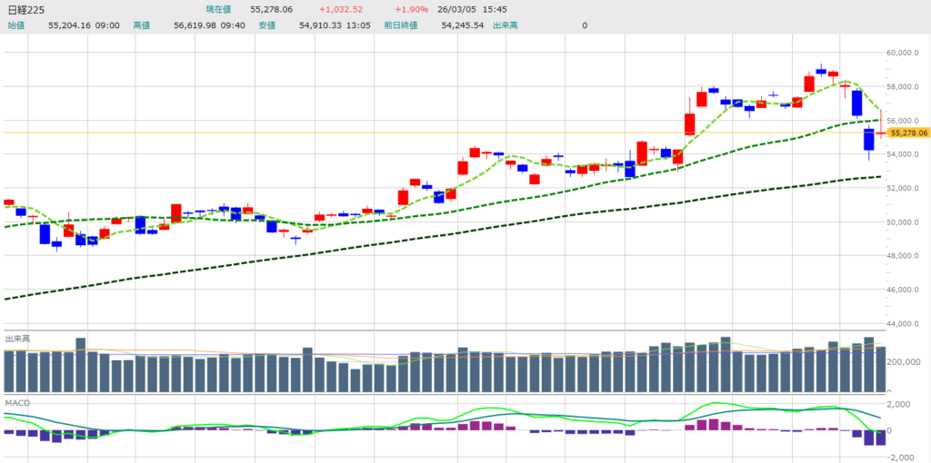 - 暴落後の「自律反発」の性質 日経平均は直近3日間で4,600円超も下落しました。本日の上昇はその2割程度を戻したに過ぎません。テクニカル的には25日移動平均線(約56,000円)を下回ったままであり、戻り待ちの売り圧力が非常に強い状態です。