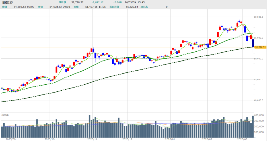 本日、2026年3月9日の日経平均株価は大幅続落となりました。 主要な数値は以下の通りです。