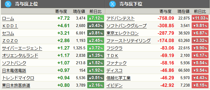 解説 アドバンテスト同様、半導体セクターの代表格として激しい売りにさらされました。 世界的な景気後退シナリオが現実味を帯びる中、設備投資の先送り懸念が売り材料となっています。 寄与度の高い値嵩株であるため、同社の下落は市場心理をさらに冷え込ませ、他銘柄への波及効果を生む悪循環を作り出しました。