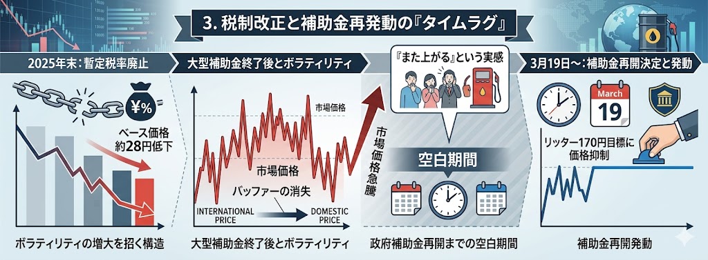 - バッファーの消失:大型の補助金が一旦終了したことで、国際価格の変動がダイレクトに国内価格に連動するようになった。現在、政府が3月19日からの補助金再開(リッター170円目標)を決定したが、その発動までの「空白期間」に市場価格が急騰したことが、今回の「また上がる」という実感に繋がっている。