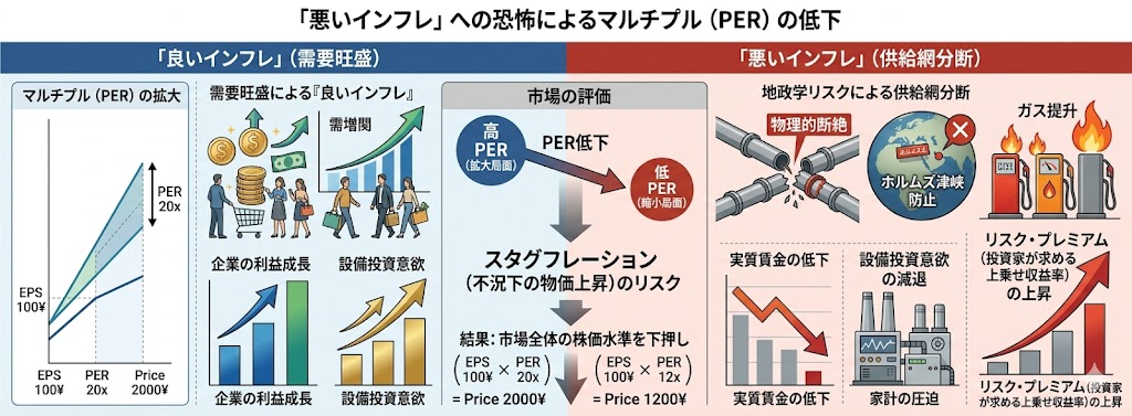 今回のガソリン高騰は、需要が旺盛だから上がる「良いインフレ」ではない。地政学リスクという供給網の「物理的」な分断によって引き起こされた「悪いインフレ」だ。これは、消費者の実質賃金を低下させ(家計の圧迫)、企業の設備投資意欲を削ぐ。市場は「スタグフレーション(不況下の物価上昇)」のリスクを数理的に織り込み始め、株式市場全体に対する「リスク・プレミアム(投資家が求める上乗せ収益率)」を上昇させる。結果として、企業の利益が成長しても、株価がその利益をどれだけ評価するかという倍率(PER:株価収益率)が低下し、市場全体の株価水準が下押しされる。