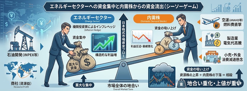 原油高は、石油開発(INPEX等)や商社(資源益)にとっては「構造的な利益増」を意味する。機関投資家は、インフレヘッジ(物価上昇への備え)として、これらのセクターに莫大な資金を投じる。その一方で、燃料費が営業利益を直撃する空運(ANAHD等)や、電気代高騰が響く製造業、さらには消費減退が懸念される小売・外食などの「内需株」からは資金を吸い上げる。結果として、日経平均株価などの指数は、資源株の上昇と内需株の下落が相殺し合い、地合いそのものが重くなる(上値が重くなる)。