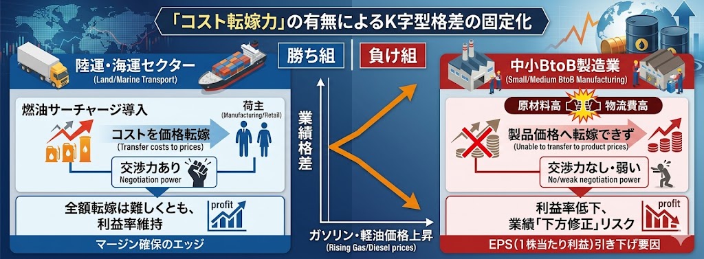 ガソリン(原油)高騰は、株式市場において「全産業的なコストプッシュ・インフレによる利益圧迫」と「K字型セクターローテーション(資金移動)の加速」を独自の構造で引き起こしている。