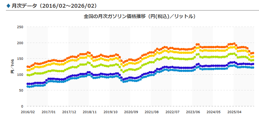 しかし、2025年末に暫定税率が廃止されたことで約28円の減税効果が働いており、さらに政府が補助金を再発動させているため、今のところ200円突破という最悪の事態は食い止められている状況です。