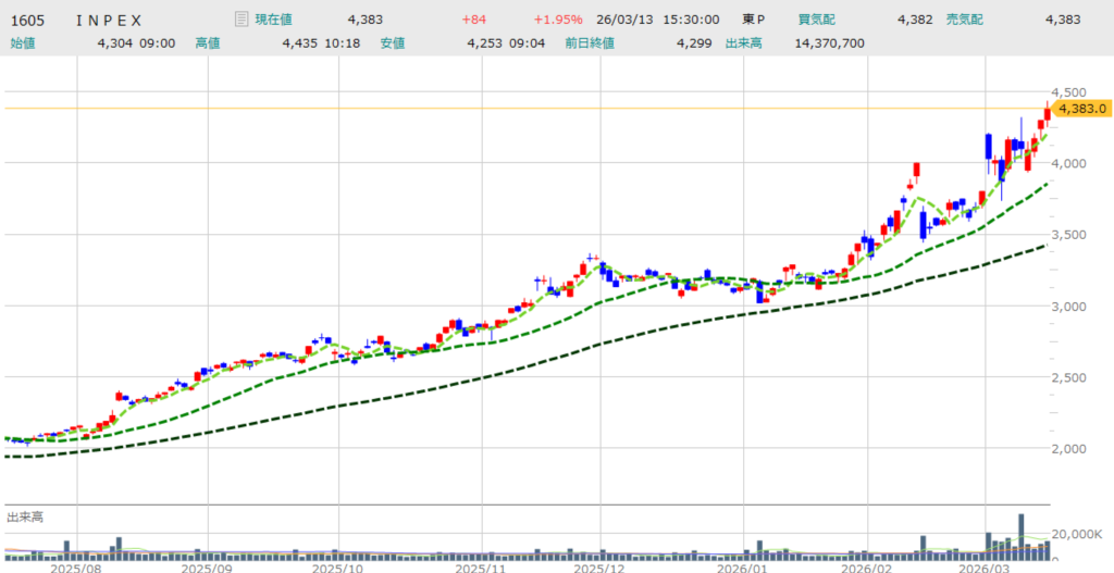- 数値的根拠:INPEXの配当利回りは現在4%を超えており、高配当銘柄としての「下値支持線」としても機能している。原油高継続の期待値 $E = +7.2\%$ を背景に、キャピタルとインカムの両取りを狙う。