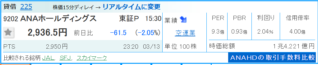 ・アクション2:ANAホールディングス(9202)をショート(空売り)