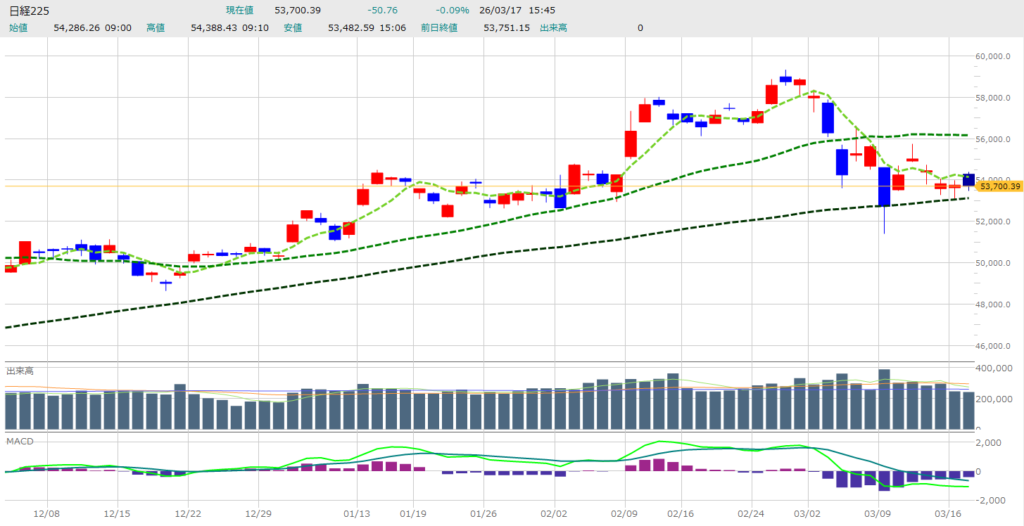 本日、2026年3月17日の日経平均株価の動きは以下の通りです。