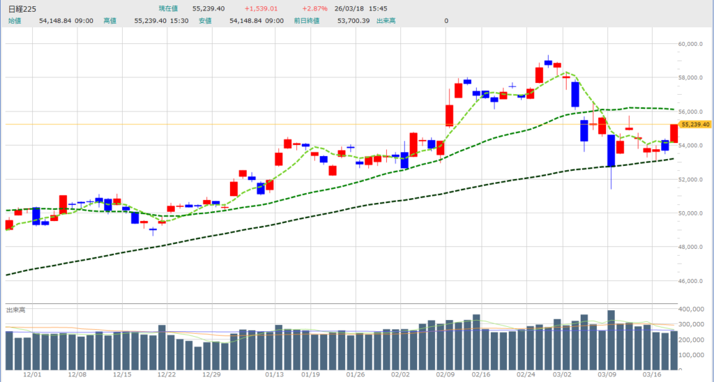 本日、2026年3月18日の日経平均株価は、昨日の停滞が嘘のような歴史的な暴騰を見せました。