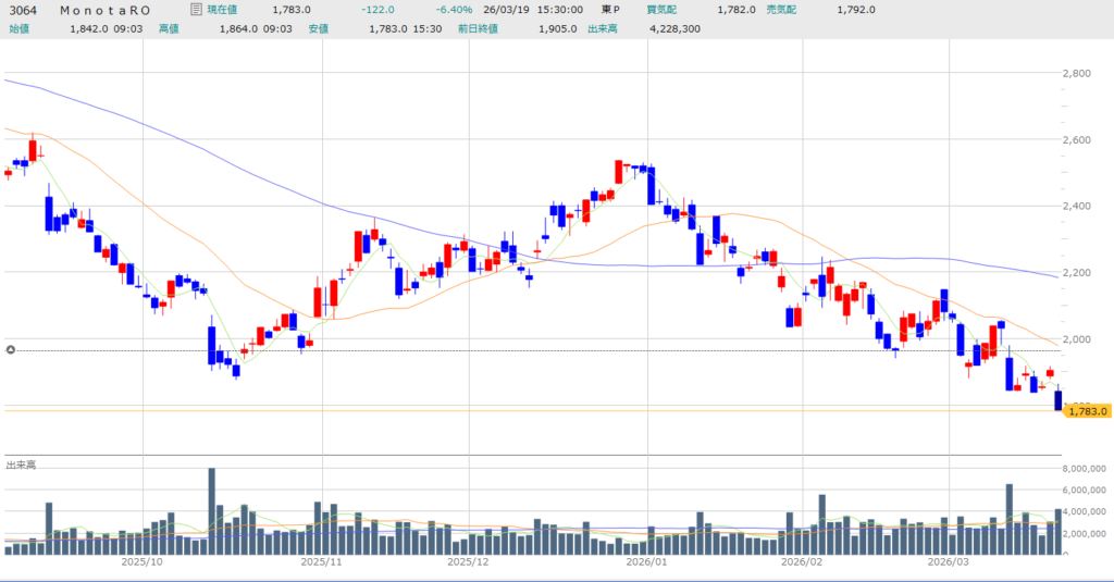 今日の暴落相場の中で、私がどうしても放っておけない銘柄がモノタロウです。私の勤め先の倉庫でも、あの段ボールを見ない日はありません。現場でこれだけ支持されている企業が、なぜここまで叩き売られるのか。素人目には「お買い得」に見えてしまいますが、プロの視点では極めて警戒が必要な局面だと分析します。